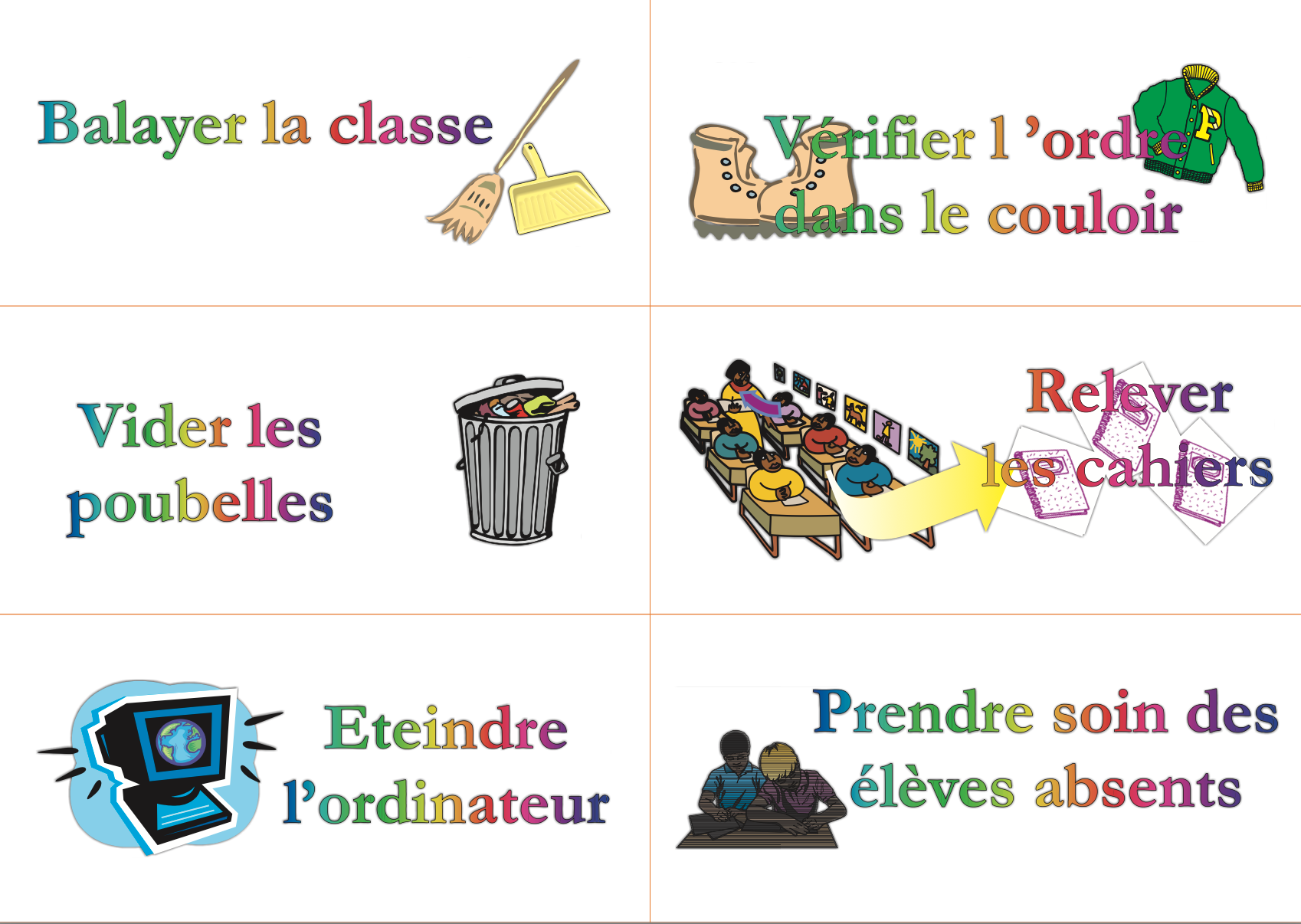 Depuis quelques années, j’ai remis en question le fait que les élèves aient tour à tour des tâches à effectuer pour le bien commun. Souvent, il les oublient ou les accomplissent à contre-coeur. Pendant le dernier cycle, j’ai mis en place des assistants de l’enseignant. La tâche est bien plus gratifiante et les élèves effectuent de multiples petites tâches avec bon coeur.
