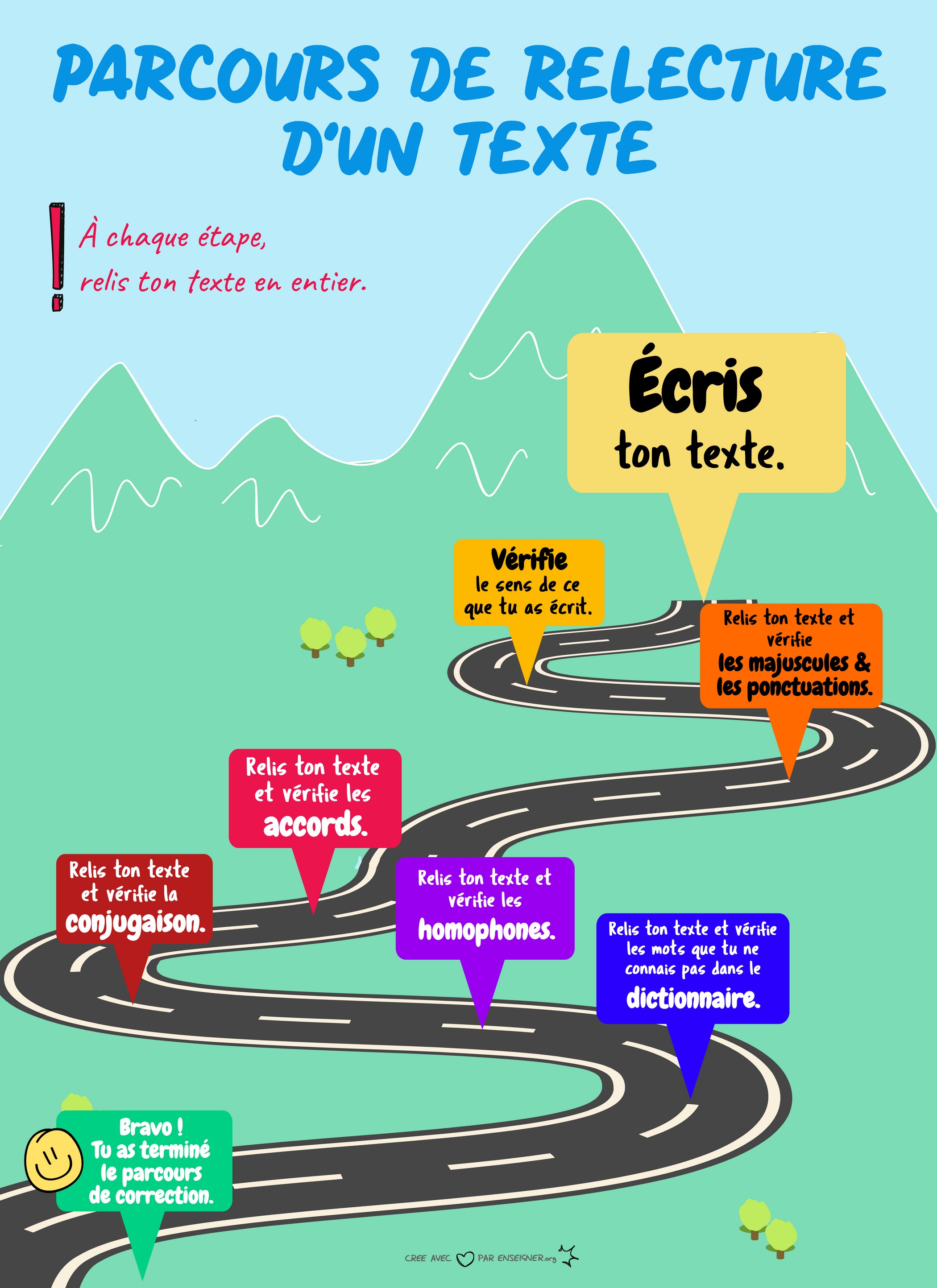 J'ai donc passé ma soirée à créer le graphisme de ma routine de relecture de texte, désirant sortir de la liste de choses à faire pour une illustration bien plus agréable. C'est ce vers quoi je tends de plus en plus actuellement. Le contenu était connu, restait à rendre concrètement l'idée que j'avais en tête. Après quelques heures de travail, le rendu me semblait cohérent et plutôt joli… mais est-ce que les élèves allaient comprendre ce que je leur voulais. Parce que, si moi je connaissais par cœur la liste des étapes de la routine, eux la découvraient à partir de mon joli dessin et que le but était quand même bien plus qu'ils la mettent en pratique que d'avoir une œuvre d'art à coller dans leur cahier.