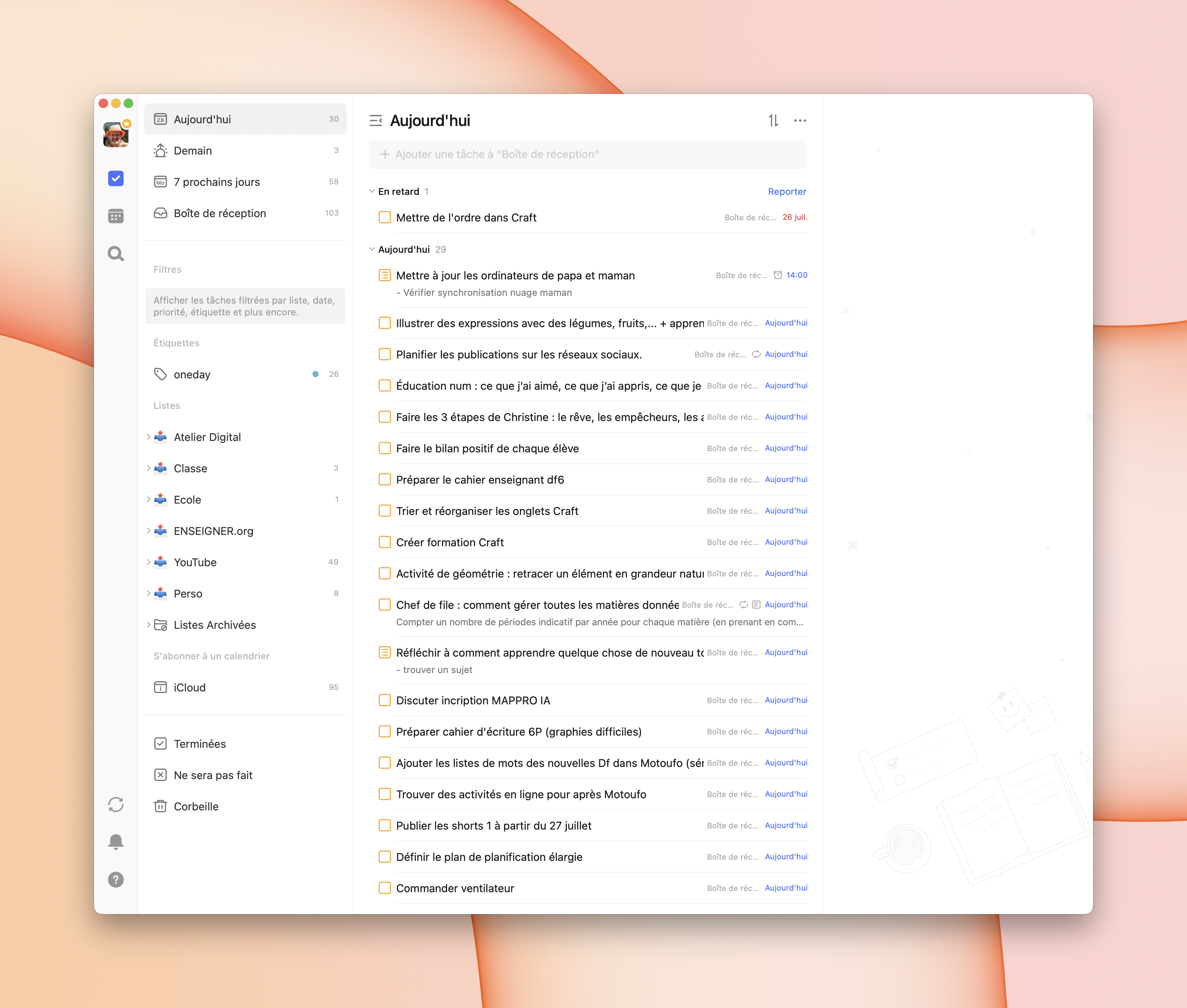 Afin de ne pas planifier dans le vide ces 3 semaines de préparation, combinant jours légers — comme demain où je partirai toute la journée à la montagne avec mon papa — et jours plus remplis pour avancer à fond dans un thème, j’ai planifié toutes les activités pour aujourd’hui, jour de la reprise. Je vais donc redécouvrir dans quelques instants tout ce que j’ai noté et agender la préparation des activités sur les journées disponibles.