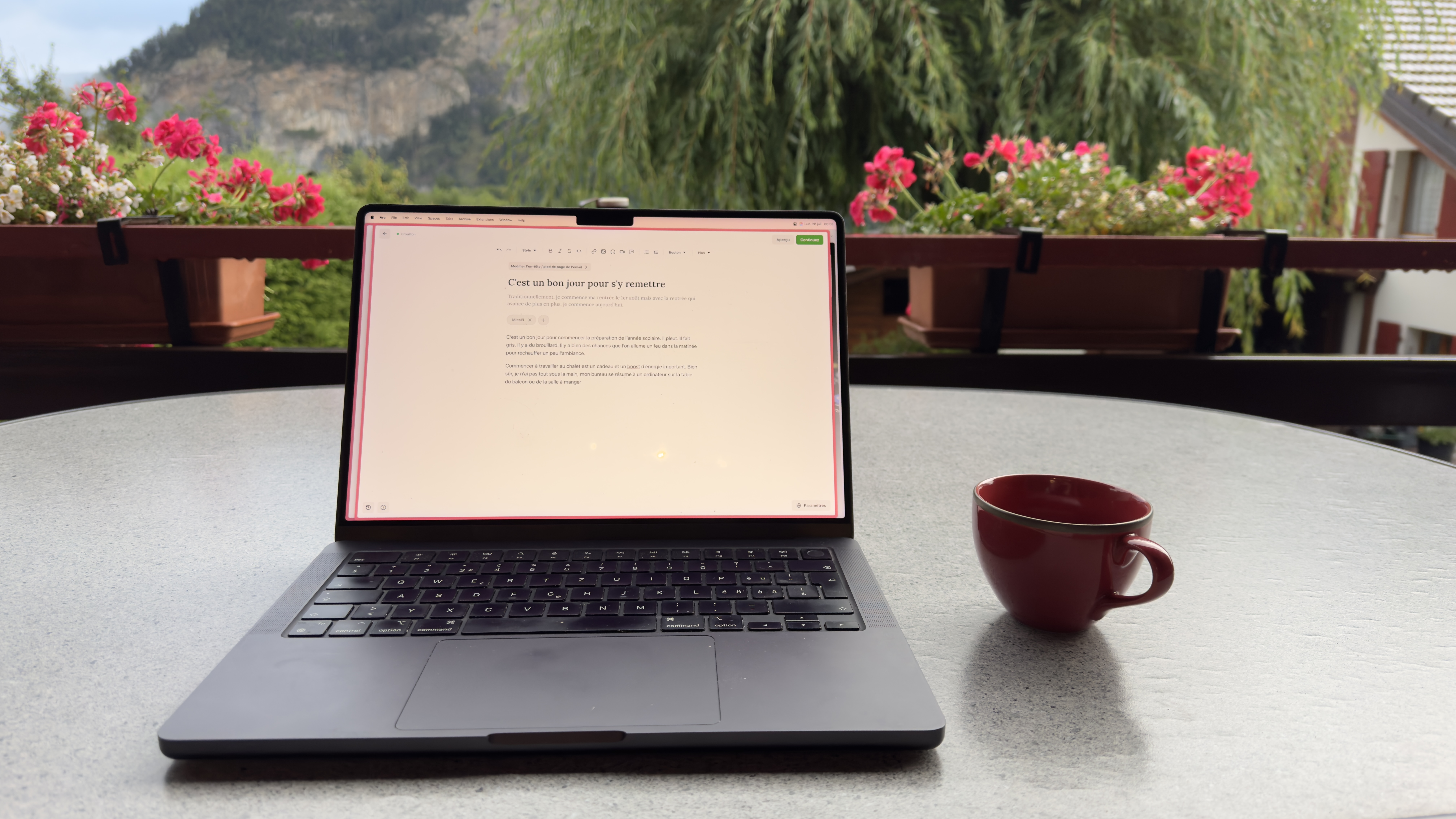 Commencer à travailler au chalet est un cadeau et un boost d’énergie important. Bien sûr, je n’ai pas tout sous la main, mon bureau se résume à un ordinateur sur la table du balcon ou de la salle à manger, mais l’atmosphère générale est agréable et me donne vraiment cette impression de travailler en vacances, cette année d’autant plus que j’y passerai toute ma première semaine de préparation.