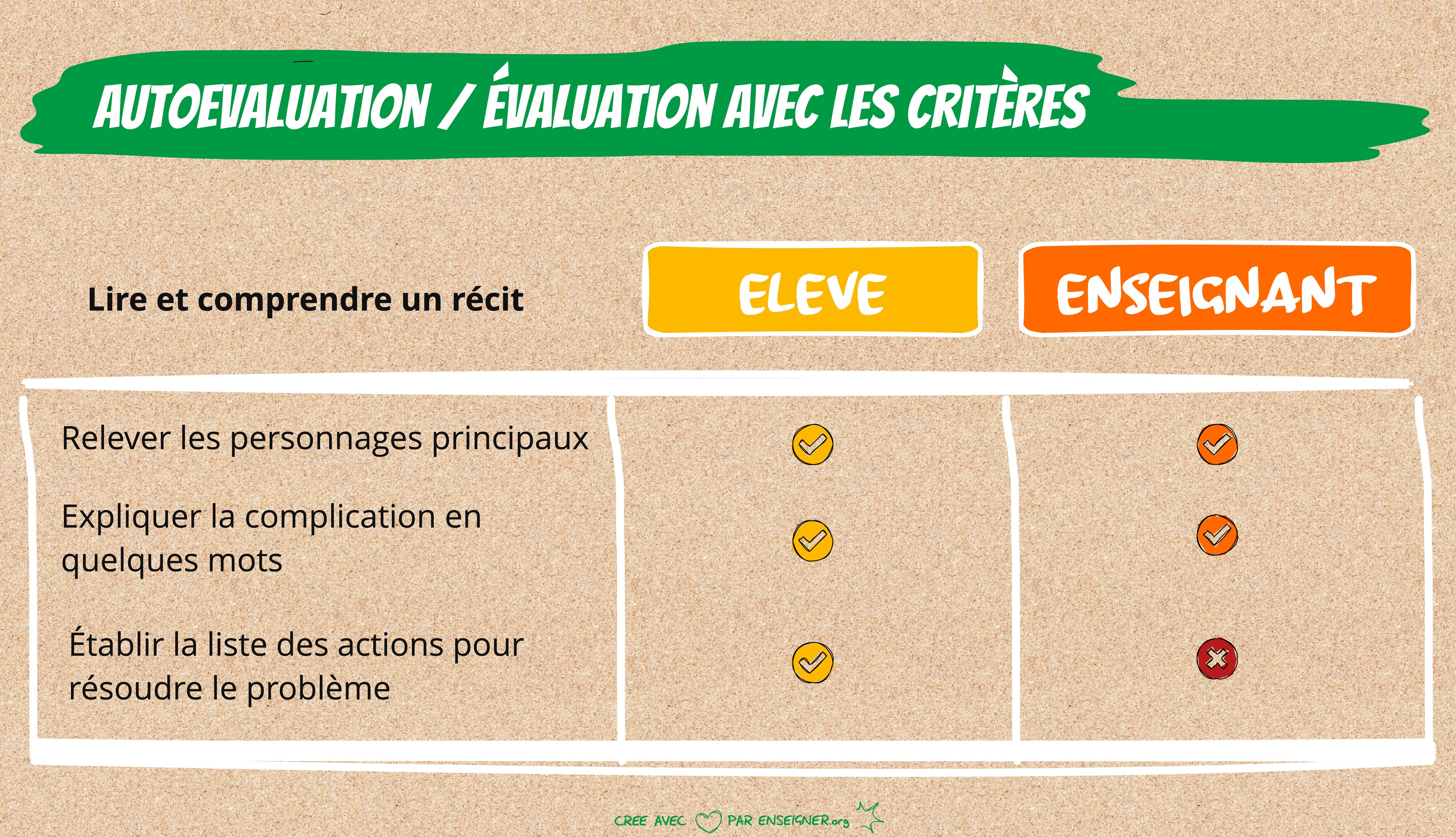 - les critères de réussite : ils sont prévus et communiqués dès le début de la séquence comme je l’explique dans cette vidéo. Ils peuvent être résumés par une liste dans laquelle les élèves pourront cocher la case de chaque élément qu'ils pensent avoir acquis. Lors de l'évaluation, l'enseignant pourrait valider également ces éléments.
