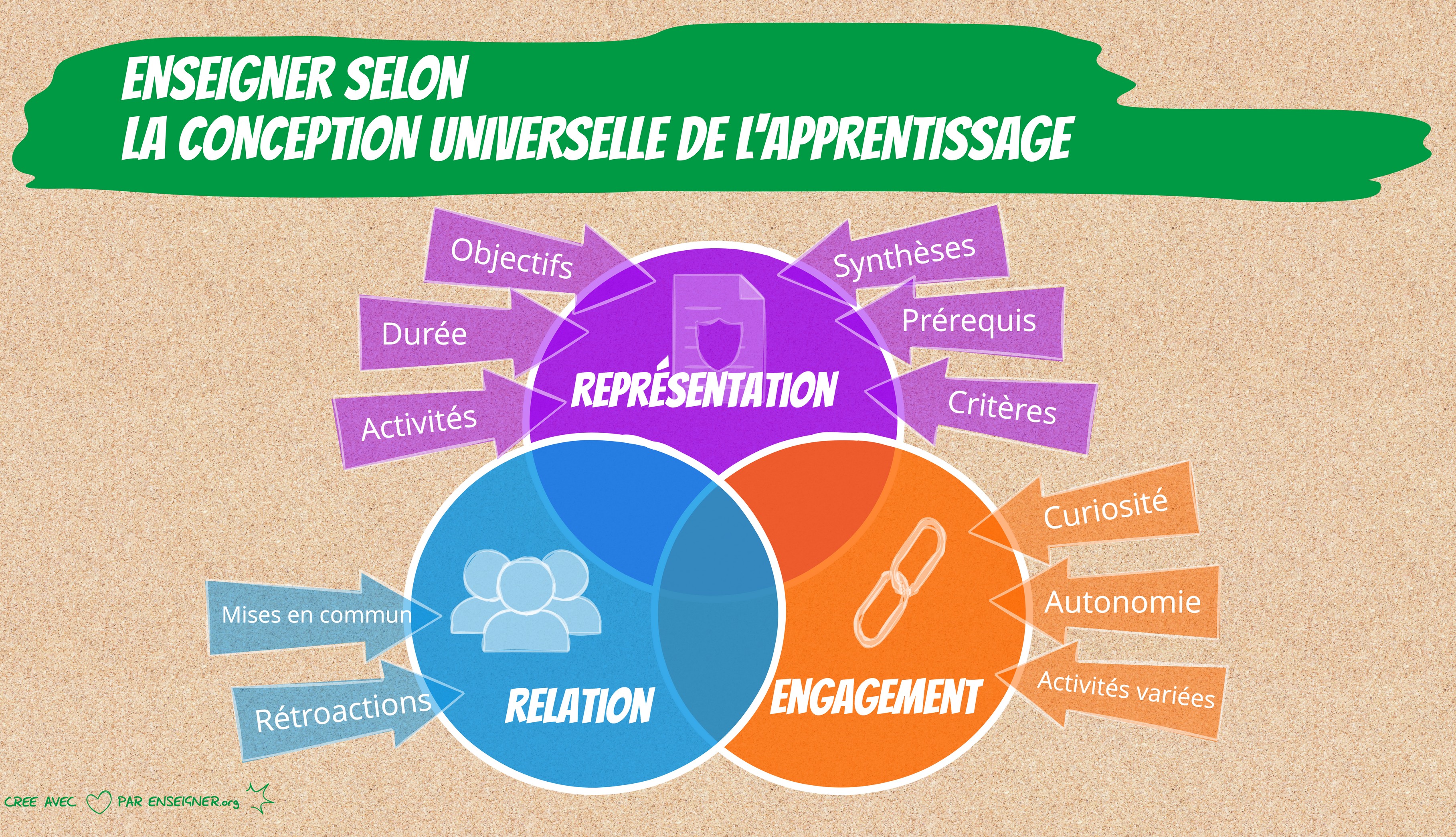 La conception universelle de l’apprentissage insiste sur le comment on vivra un apprentissage, comment on mettra la préparation de séquence en action. Il s'agit d’une attitude à adopter, de réflexes à acquérir pour que les élèves puissent apprendre le mieux possible.