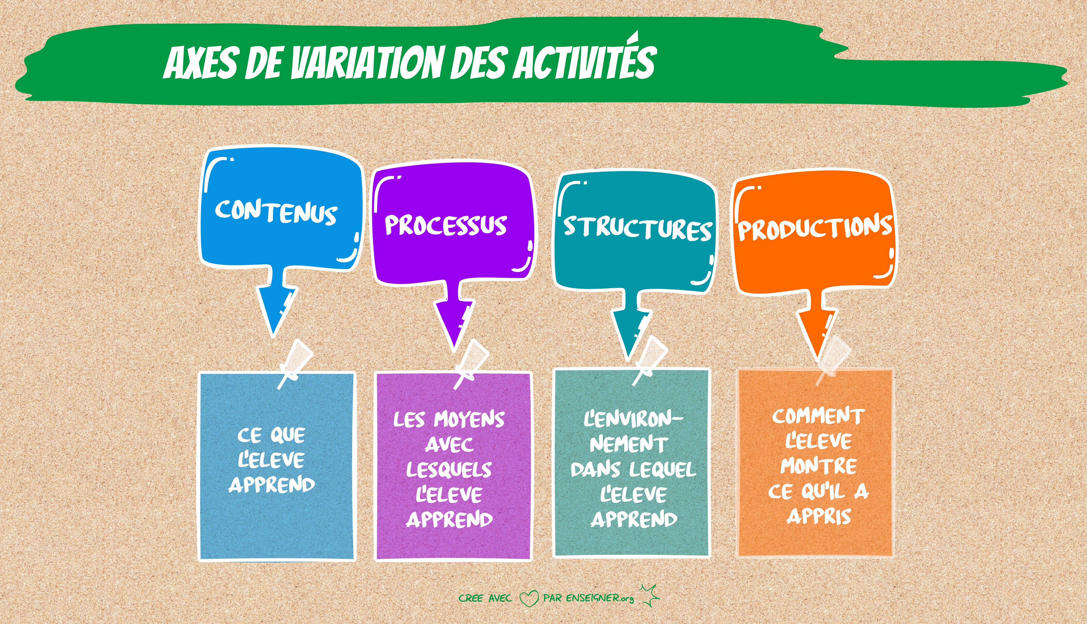 - des activités diversifiées : différents supports, différents types de tâches, des manipulations,… Cet élément se rapproche de l'enseignement flexible en utilisant les variables de structure, de processus, de contenus et de production.