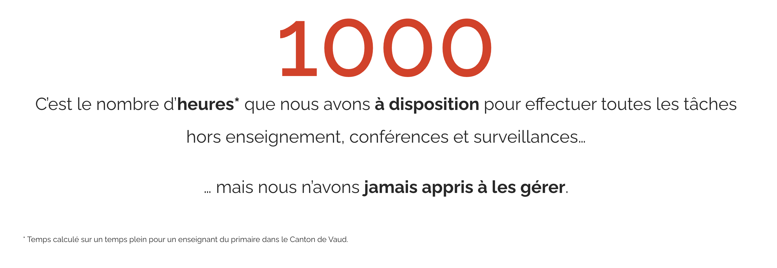 En Suisse romande, nous avons du temps pour préparer les cours, pour les rendez-vous avec les parents et les réseaux avec les spécialistes, du temps aussi pour rédiger les différents rapports, les contacts avec notre hiérarchie et temps encore pour remplir les innombrables formulaires. Pensez, nous avons 1000 heures annuelles (pour un enseignant primaire à temps plein). Mais, nous avons également un grand souci : nous avons été formés et nous nous considérons bien trop souvent comme un employé, un exécutant alors que notre fonction d’enseignant et de maître-sse de classe est bien plus proche de celle d’un manager, d’un cadre, voire d’un manager… à une différence près : nous n’avons pas appris à remplir ces fonctions. Nous n’avons pas appris à régir notre temps de manière efficace, à gérer les informations que nous recevons à bon escient, ni à classer toutes nos trouvailles et perles de manières à les retrouver rapidement…