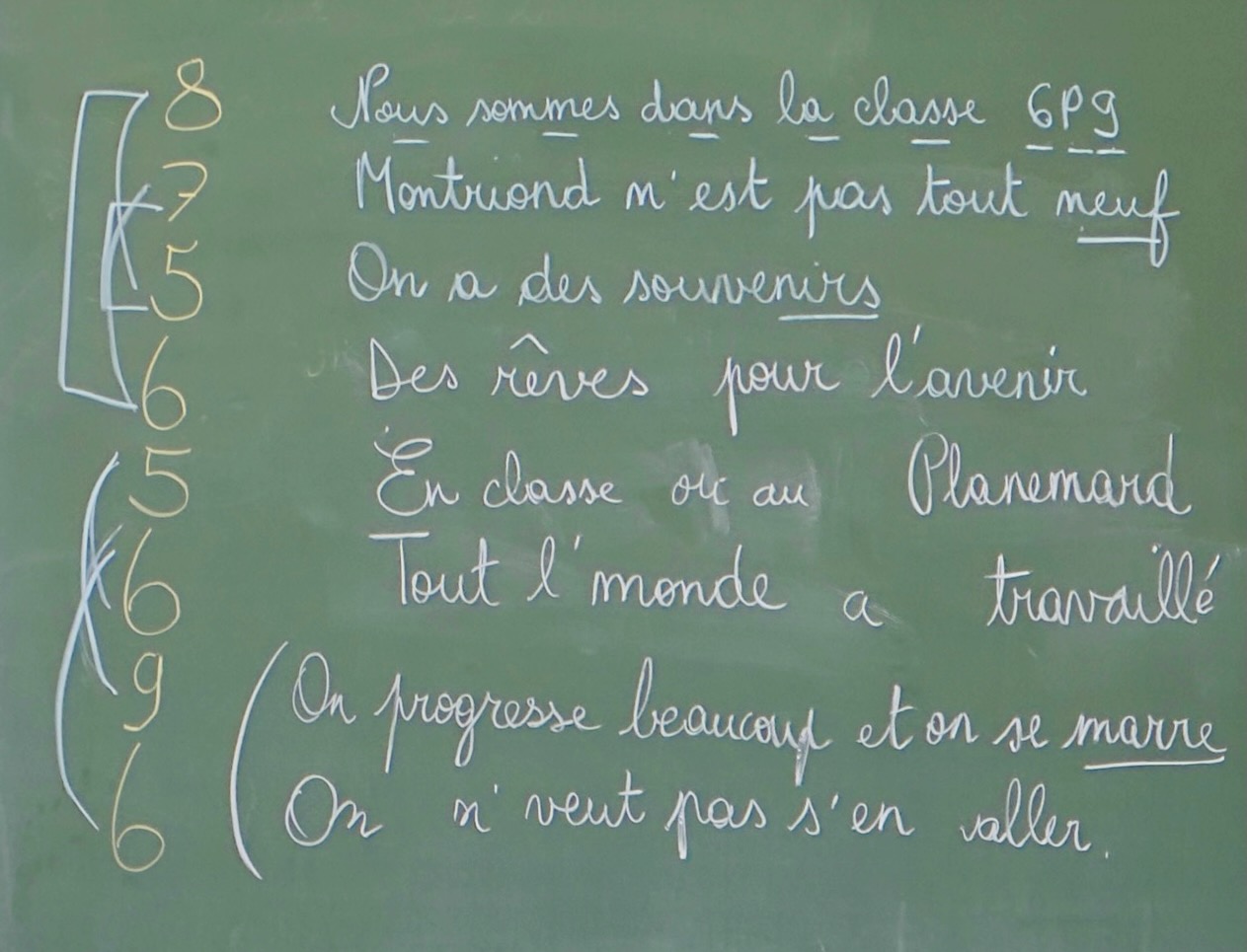 En lien avec les forces et faiblesses des élèves en présence, ce n’était pas gagné, mais je me souviens encore de cette fin de matinée où nous avons posé les vers du refrain et où même les élèves les plus réfractaires à l’école et à la participation à la vie de la classe avaient apporté plus qu’à leur tour une pierre à l’édifice.