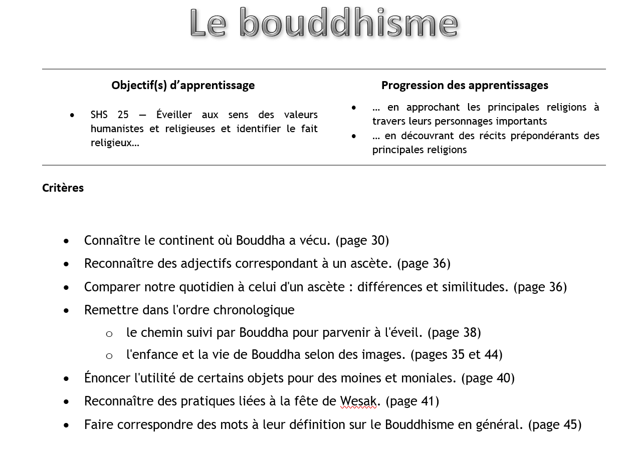 J'ai l'habitude de définir par écrit et d'étudier avec mes élèves les critères qui soutiendront la prochaine évaluation. Non seulement la compréhension de ceux-ci permet de réduire leur stress mais elle leur permet également de s'impliquer dans l'apprentissage des objectifs, les rendant acteurs une fois de plus de leur évaluation. Donner des critères sans qu'ils soient compris n'a pas grand sens, c'est pour cela que nous en discutons ensemble, afin qu'ils fassent les liens entre ce qui est attendu d'eux et ce qui a été vu en classe. Selon la matière, j'ajoute également quelques numéros de page relatifs aux activités que nous avons réalisées en classe, comme l'a fait ma stagiaire pour son évaluation concernant le bouddhisme dans l'illustration ci-dessous.